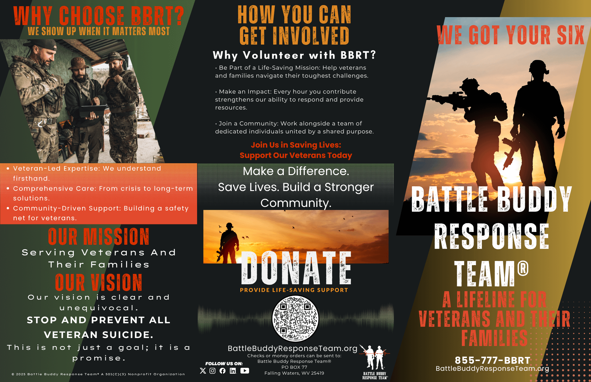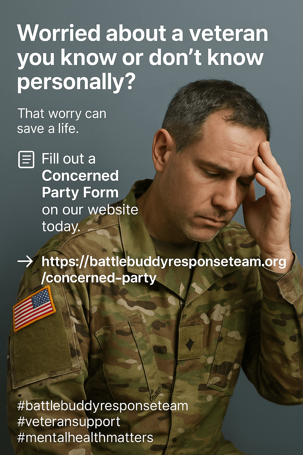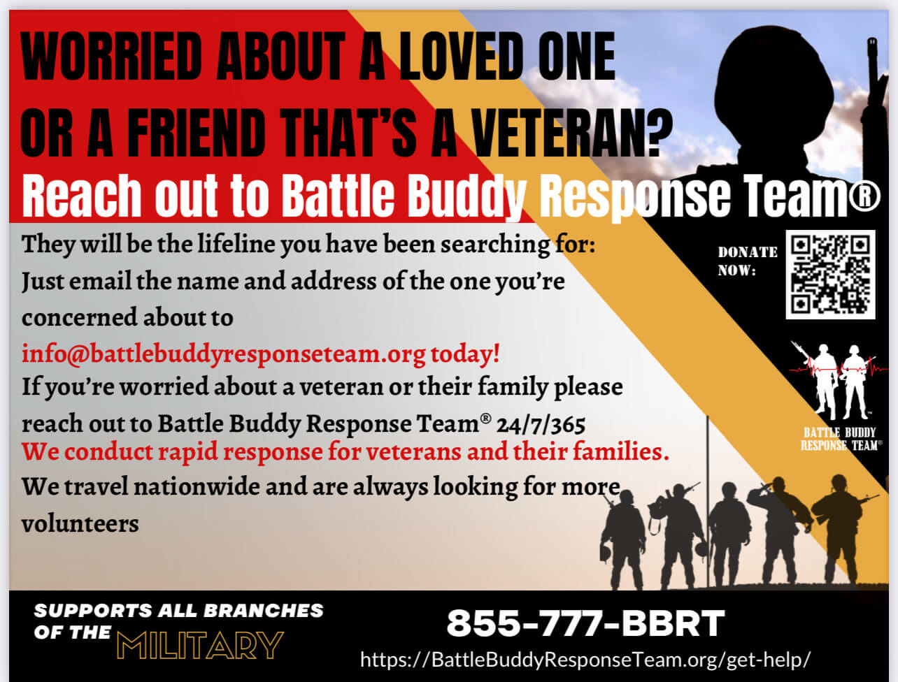 Unfortunately, Battle Buddy Response Team® has seen firsthand the aftermath of when Veterans were in crisis and didn't know who to turn to for help. Trauma, isolation, physical injury, mental health illnesses, sometimes coupled with addiction, can be debilitating for the Veteran and can often create a barrier that a concerned party doesn't know how to breach. This is why it is imperative for family members, friends and even acquaintances to reach out to Battle Buddy Response Team® when they are concerned about a Veteran or their family member because of our unique ability to relate to and be able to help Veterans in need.