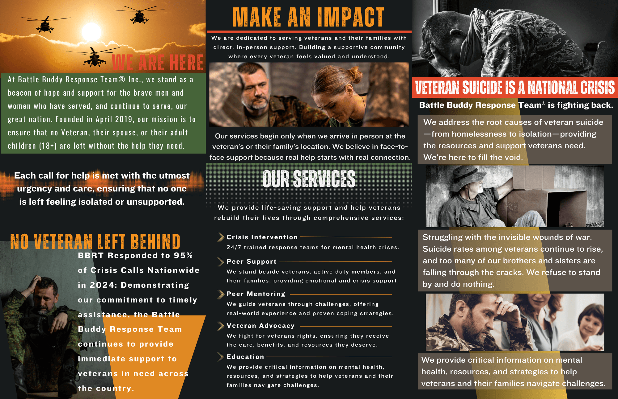 At Battle Buddy Response Team® Inc., we stand as a beacon of hope and support for the brave men and women who have served, and continue to serve, our great nation. Founded in April 2019, our mission is to ensure that no Veteran, their spouse, or their adult children (18+) are left without the help they need. If you are concerned about a Veteran or their family, do not hesitate to reach out to us. With a simple email, you can set in motion our dedicated Veteran Response Team, who will swiftly and efficiently come to the aid of those in need at the address you provide.